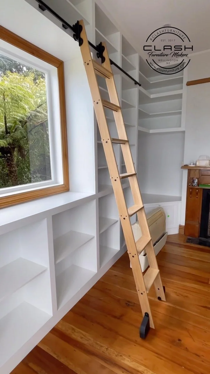 ![Built In White Bookcase / Library Unit made from laser edged white melteca with thickened surrounds and a rolling ladder system. Shelves are filled with colourful books with ratan baskets on the lower levels.]()  Built in Bookcase/Library